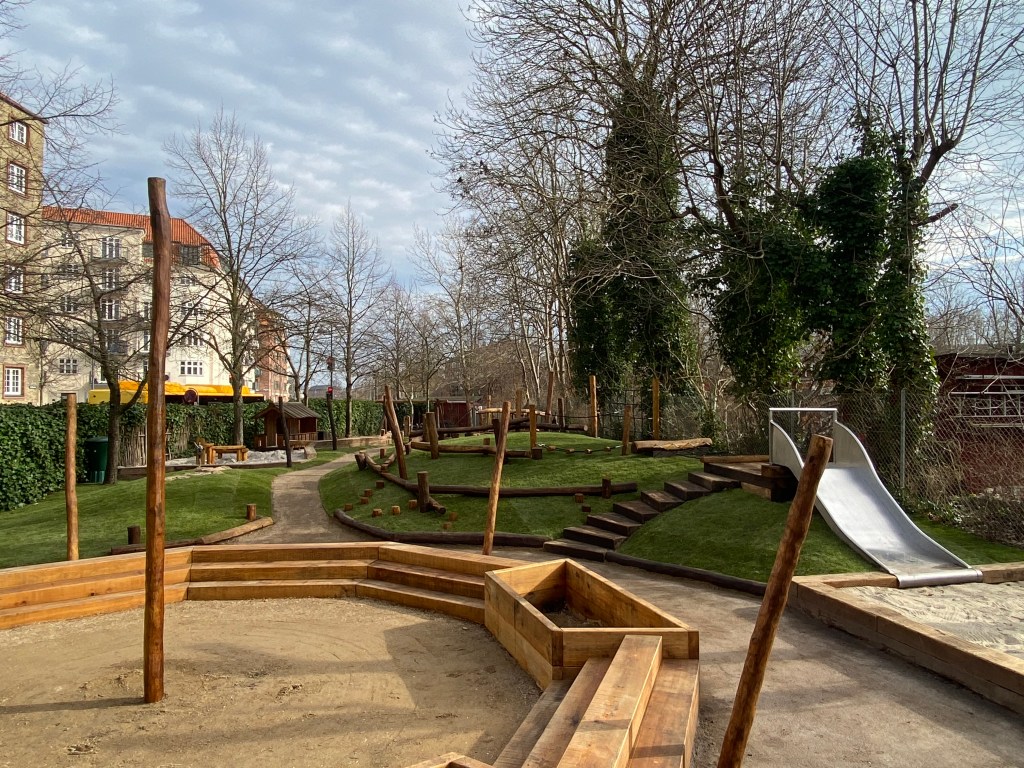 - Zonering: Området er inddelt, så de mindste vuggestuebørn har trygge rammer, mens børnehavebørnene har plads til at udfolde sig på klatrestativer og i mere krævende terræn.